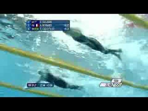 動画は、2008年の北京オリンピックでの男子100m自由形決勝の様子です。